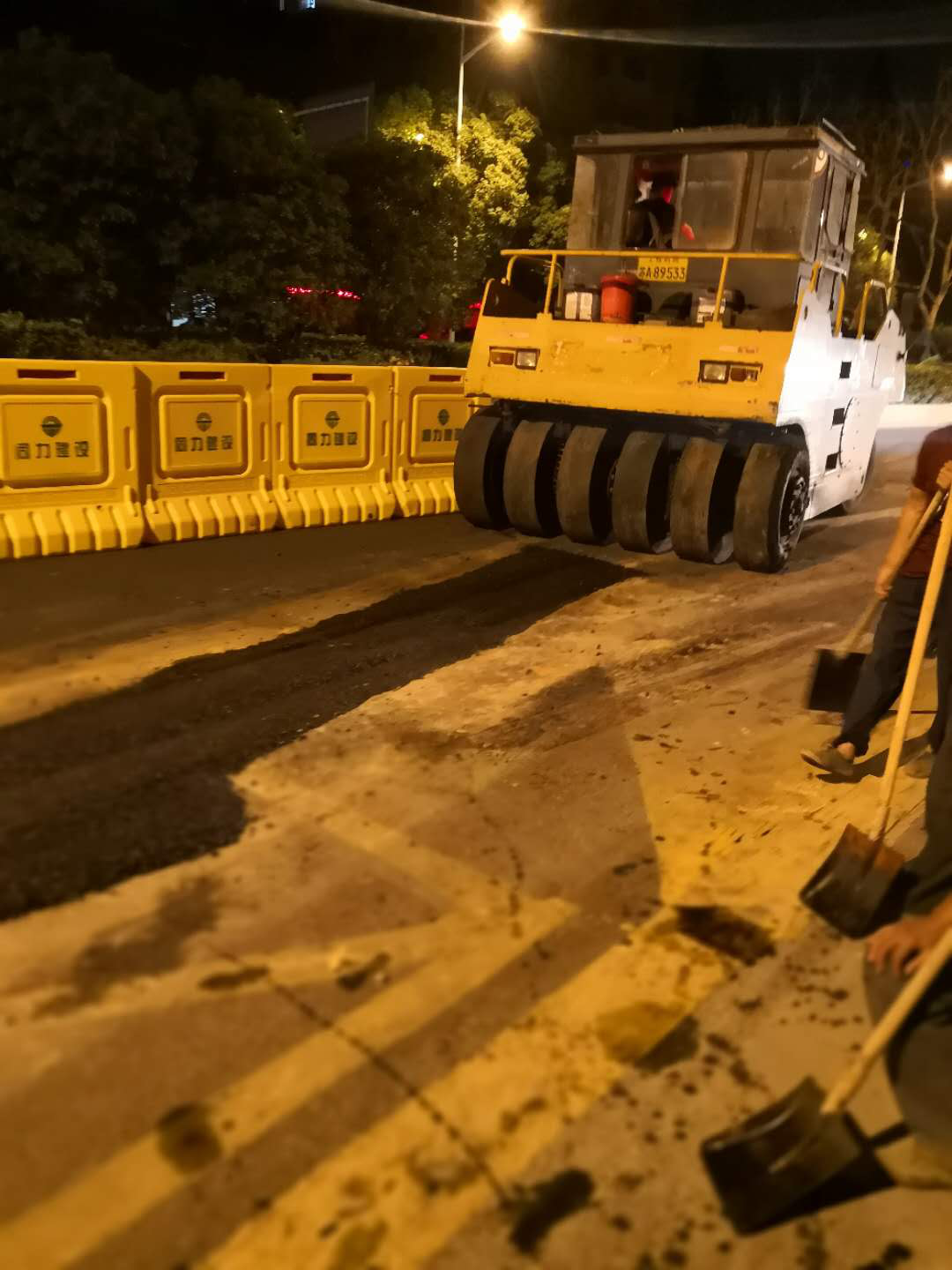 龍蟠中路整治中最大難點在于承載交通壓力大,施工時間受很大約束。首先是每日的工作時間較短,雖前期做了大量溝通工作,但鑒于龍蟠中路是城市南北向交通大動脈,施工容易造成嚴(yán)重?fù)矶隆9首罱K只能在每日夜間21:00至次日凌晨6:00于進(jìn)行施工,其余時段均需保證全時段無占用通行。在復(fù)雜不利的環(huán)境下,緊抓“定時清場法”、施“單元施工法”不放松,將整條道大路劃分為十六個單元以便組織推業(yè)進(jìn)。每日夜間21:00圍擋設(shè)施、施工車輛等陸續(xù)進(jìn)場,大批施工人員和交通疏導(dǎo)人員在各個單元就位,然后根據(jù)現(xiàn)場車流量情況試用圍擋封閉部分車道,并根據(jù)測試圍擋后車流通行效果靈活調(diào)整車道封閉時間以及車道封閉數(shù)量,在確認(rèn)不會造成交通堵塞之后再圍擋施工。見縫插針、統(tǒng)籌協(xié)調(diào)、調(diào)整工設(shè)序,努力做到化難點為亮點。為了確保白天可以順利開放交通,提前擬定方案,將小面積難以壓實、大面積難以養(yǎng)生的水泥穩(wěn)定碎石道路基層處理方案,調(diào)整為小面積用砼澆筑覆蓋鋼板養(yǎng)護(hù)、大面積病害采用ATB瀝青碎石即壓即成型的方案,既保障了交通也保證了質(zhì)量。同時部署各單元作業(yè)班組集中力量在少量點位內(nèi)施工,開一段干一段收一段,不多開作業(yè)面,便于控制質(zhì)量和進(jìn)度,同時方便組織圍擋、開放交通及白天的維護(hù)巡查;對于過路溝槽、病害處理的鋼板覆蓋措施,也有多項要求及改進(jìn)。首先是確保鋼板厚度不低于2厘米,并在鋼板下放置橡膠墊,減少車輛碾壓的噪音,鋼板四周還會設(shè)置減速帶起到警示過往車輛減速以及避免鋼板發(fā)生位移,其次是對于鋼板下脫全跨度大于1米的增設(shè)槽鋼支撐,并做到24小時人員巡視不間斷。與此同時,周邊一些單位比較支持,騰出了一些空地給我們堆放材料,這樣在每天早上6點能確保圍擋和施工車輛等就近安放,恢復(fù)快車道交通。